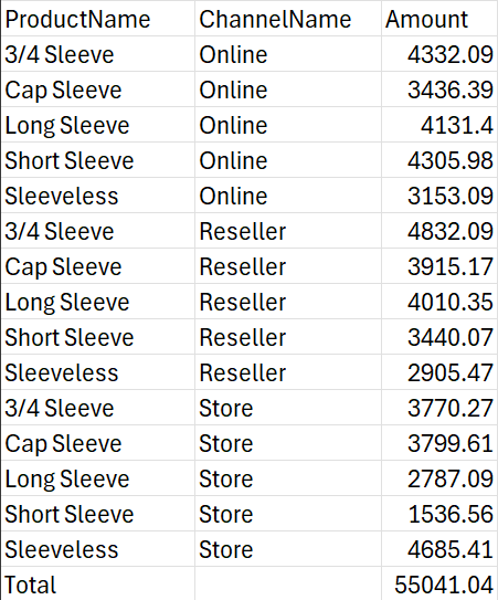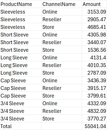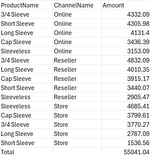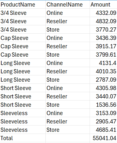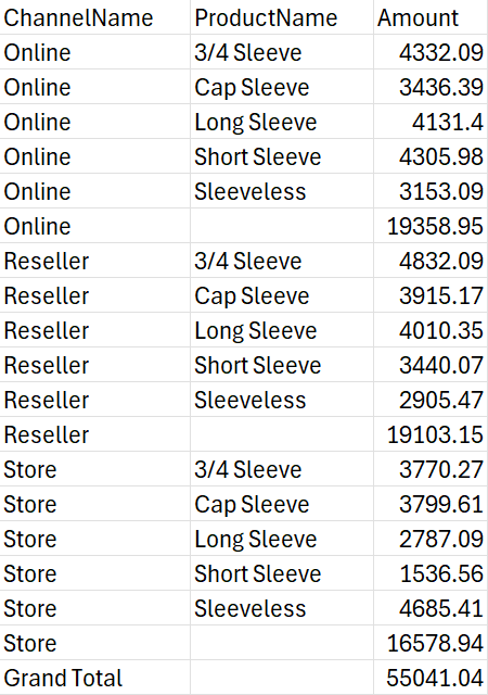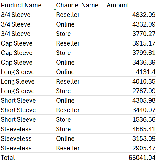 Cả 2 công thức trên đều nhóm dữ liệu theo 2 cột Product Name và Channel Name, sau đó sắp xếp cột Amount giảm dần.