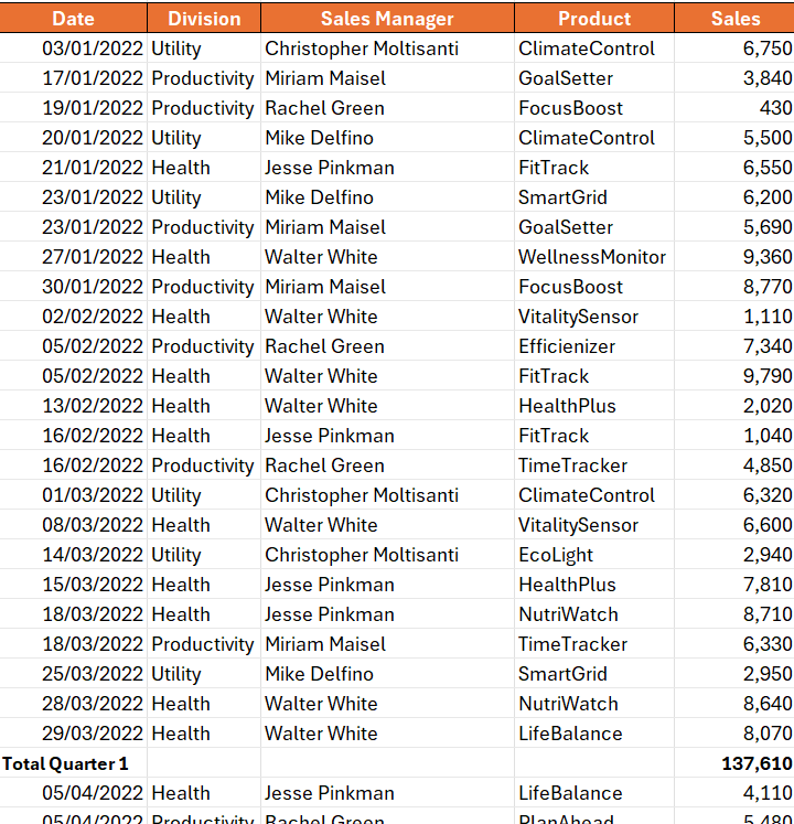 Bạn có thể thấy đây là 1 dữ liệu không được chuẩn. Khi có sự xuất hiện Sub Total như Total Quarter 1 như hình trên.