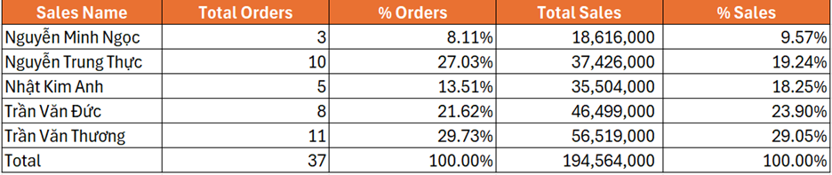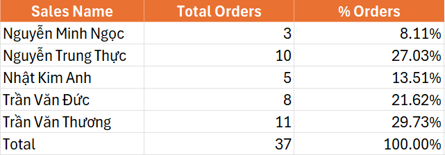 Nhiệm vụ của bạn đó là đếm xem mỗi bạn Sales có bao nhiêu đơn hang, và số đơn hàng của bạn Sales đó chiếm bao nhiêu % trên tổng số đơn hàng.