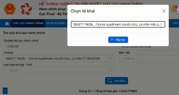 Bước 3: Người nộp thuế chọn Danh mục Thủ tục hành chính và chọn Mã TTHC: 1.008309 về Khai quyết toán thuế thu nhập cá nhân đối với tổ chức, cá nhân trả thu nhập từ tiền lương, tiền công.