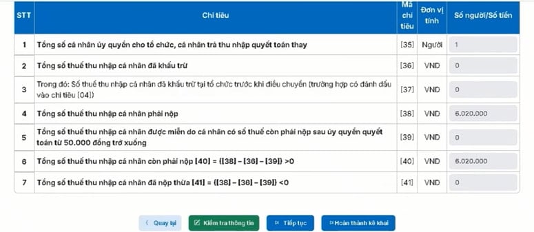Bước 10: Người nộp thuế chọn “tiếp tục”, thực hiện kiểm tra thông tin tờ khai Quyết toán, sau đó gõ mã Captcha và bấm “tiếp tục”