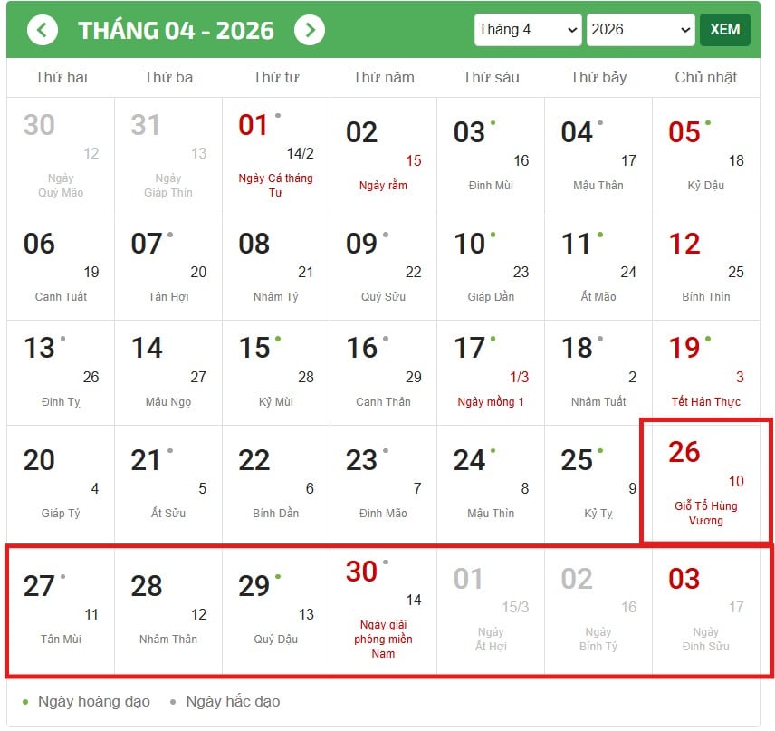 *Trên đây là thông tin Cập nhật Lịch nghỉ Giỗ Tổ Hùng Vương 2026, Lịch nghỉ lễ 30 4 và 1 5 năm 2026 chính thức của NLĐ được nghỉ đến 09 ngày hưởng nguyên lương.