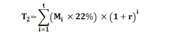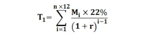– Mức đóng một lần cho nhiều năm về sau được tính bằng tổng mức đóng của các tháng đóng trước, chiết khấu theo lãi suất đầu tư quỹ bảo hiểm xã hội bình quân tháng do Bảo hiểm xã hội Việt Nam công bố của năm trước liền kề với năm đóng và được xác định theo công thức sau: