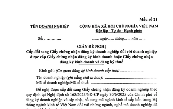 Theo đó, Mẫu giấy đề nghị cấp đổi sang giấy chứng nhận đăng ký doanh nghiệp là mẫu số 21 Giấy đề nghị cấp đổi sang giấy chứng nhận đăng ký doanh nghiệp đối với doanh nghiệp được cấp Giấy chứng nhận đăng ký kinh doanh hoặc giấy chứng nhận đăng ký kinh doanh và đăng ký thuế được quy định tại Phụ lục 1 ban hành kèm theo Thông tư 68/2025/TT-BTC.