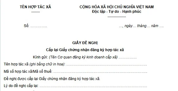 Tải về Mẫu Giấy đề nghị cấp lại Giấy chứng nhận đăng ký hợp tác xã tại đây.