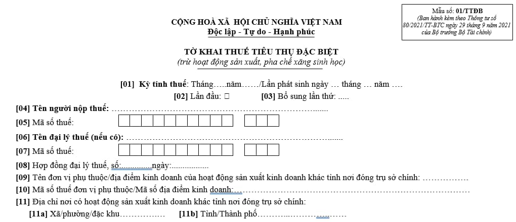 Mẫu 01/TTĐB Tờ khai thuế tiêu thụ đặc biệt (trừ hoạt động sản xuất, pha chế xăng sinh học) quy định tại Mục III Phụ lục II Danh mục mẫu biểu hồ sơ khai thuế ban hành kèm theo Thông tư 80/2021/TT-BTC được sửa đổi, bổ sung bởi khoản 7 Điều 1 Thông tư 40/2025/TT-BTC, có dạng như sau: