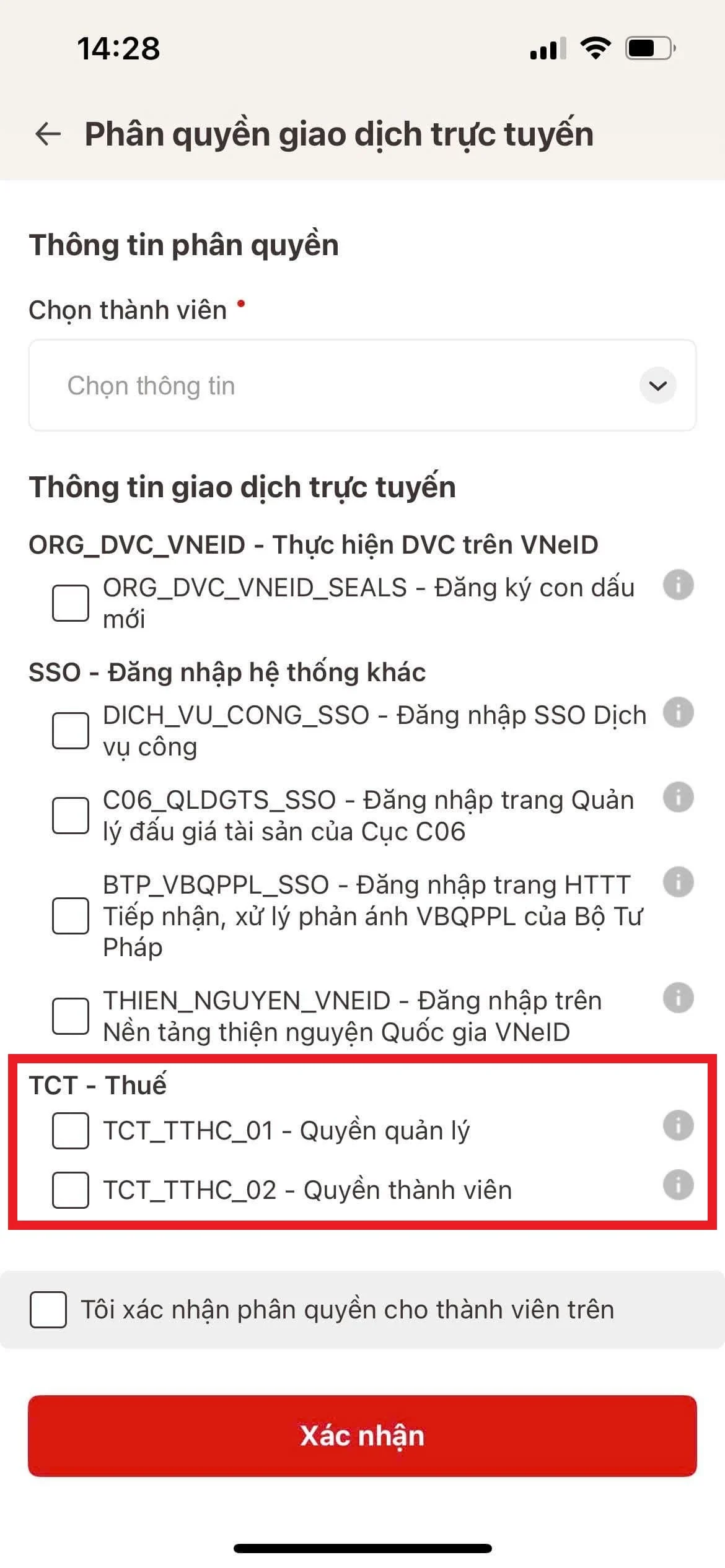 Chọn tên thành viên, tích vào các mục thành viên được phân quyền được thực hiện những gì tích chọn 2 ô tại mục “TCT-Thuế” Bấm Xác nhận