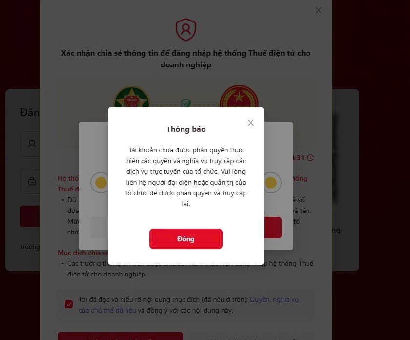 Lỗi không đăng nhập được tài khoản thuế điện tử dù đã phân quyền thường hiển thị như sau:
