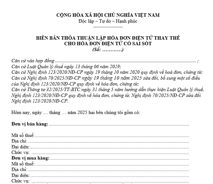 Dưới đây là mẫu biên bản thay thế hóa đơn điện tử có sai sót theo Nghị định 70/2025/NĐ-CP:
