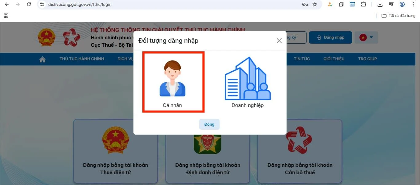Bước 4: Người nộp thuế chọn đối tượng đăng nhập là Cá nhân