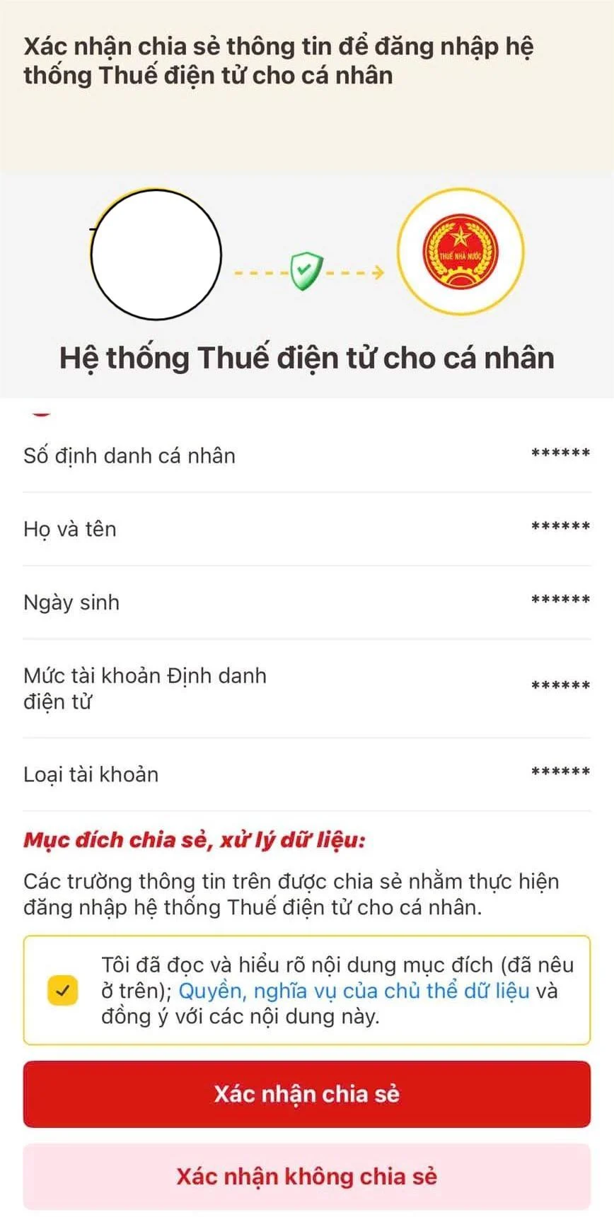 Tiếp đó, Người nộp thuế chọn Xác nhận chia sẻ bên ứng dụng VNeID để đăng nhập vào hệ thống dichvucong.gdt.gov