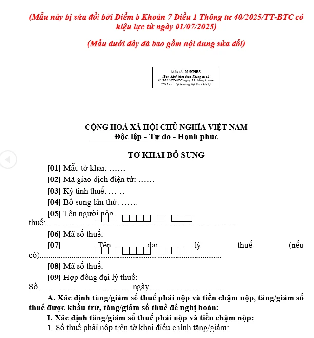 Theo Phụ lục I ban hành kèm Nghị định 373/2025/NĐ-CP quy định Mẫu Tờ khai bổ sung hồ sơ khai thuế là Mẫu số 01/KHBS.