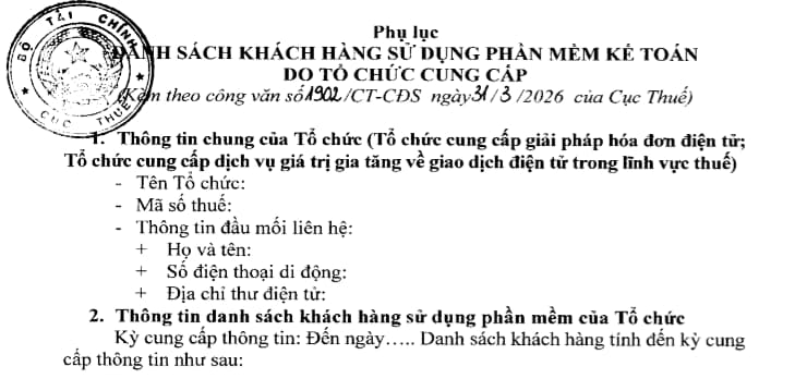 Lập danh sách toàn bộ khách hàng đã sử dụng phần mềm sổ kế toán tài chính do Tổ chức cung cấp đến hết ngày 31/3/2026 theo mẫu tại phụ lục đính kèm và gửi về Cục Thuế trước ngày 08/4/2026. Đồng thời, định kỳ trước ngày mồng 5 của tháng tiếp theo, các Tổ chức gửi thông tin cập nhật các trường hợp thay đổi về danh sách khách hàng sử dụng về Cục Thuế. Địa chỉ thư điện tử tiếp nhận thông tin của Tổ chức: baocao.pmkt@gdt.gov.vn.