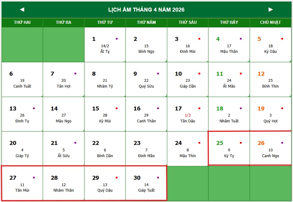 LỊCH VẠN NIÊN THÁNG 4 – THÁNG 5 NĂM 2026: |