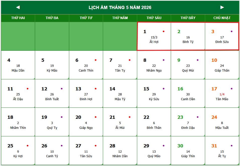 Theo Lịch vạn niên năm 2026 thì lễ Giỗ tổ Hùng Vương và 30 4 – 1 5 năm 2026 sẽ rơi vào các ngày như sau: