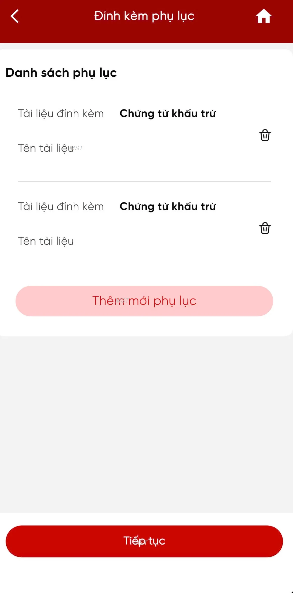 Hệ thống hiển thị màn hình Đính kèm phụ lục, bắt buộc đính kèm ít nhất 1 tài liệu.