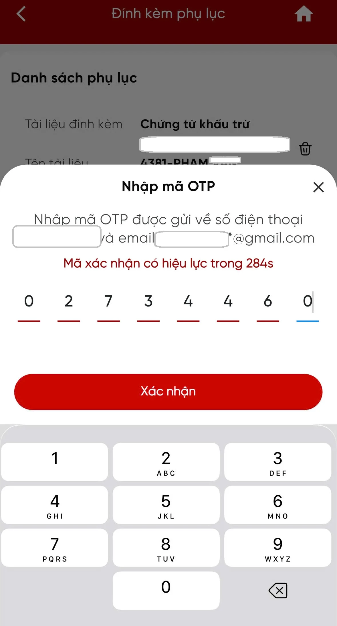 Bước 10: Chọn Tiếp tục, hệ thống hiển thị màn nhập OTP được gửi về số điện thoại của NNT.