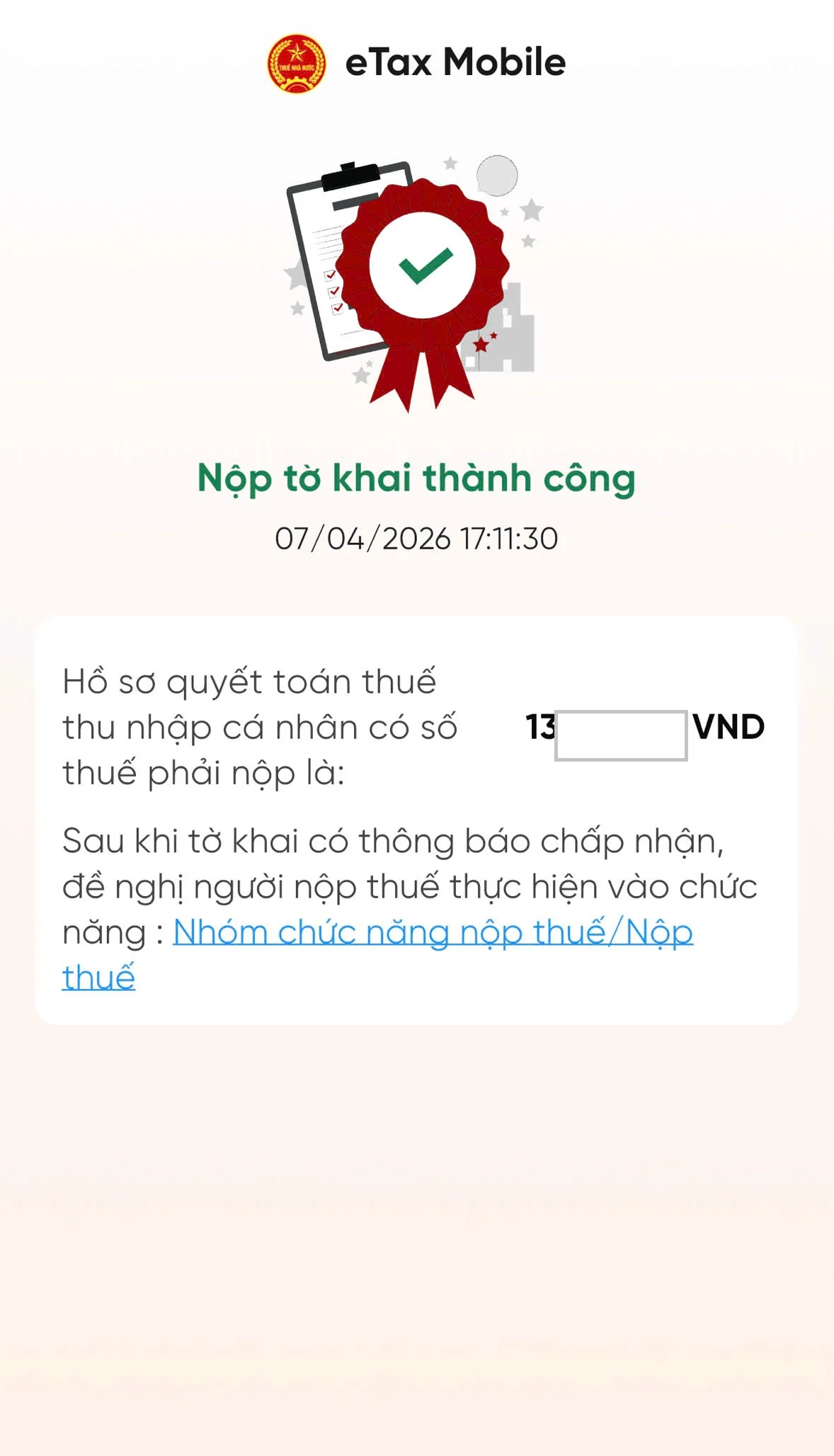 Dưới đây là hướng dẫn quyết toán thuế TNCN trên Etax Mobile 2026 nhận tiền hoàn thuế khi [Số thuế hoàn trả cho người nộp thuế] > 0