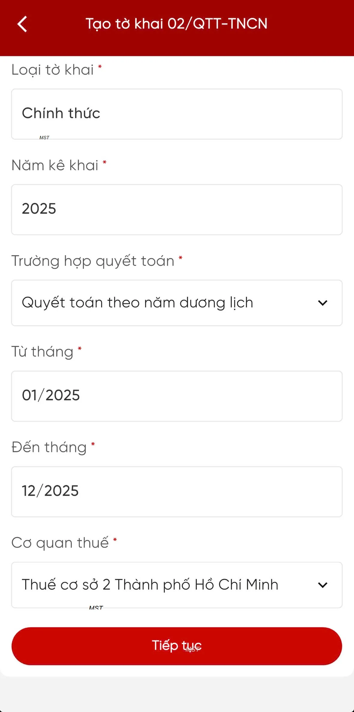 – Trường hợp quyết toán: Hiển thị mặc định Quyết toán theo năm dương lịch, không cho sửa.