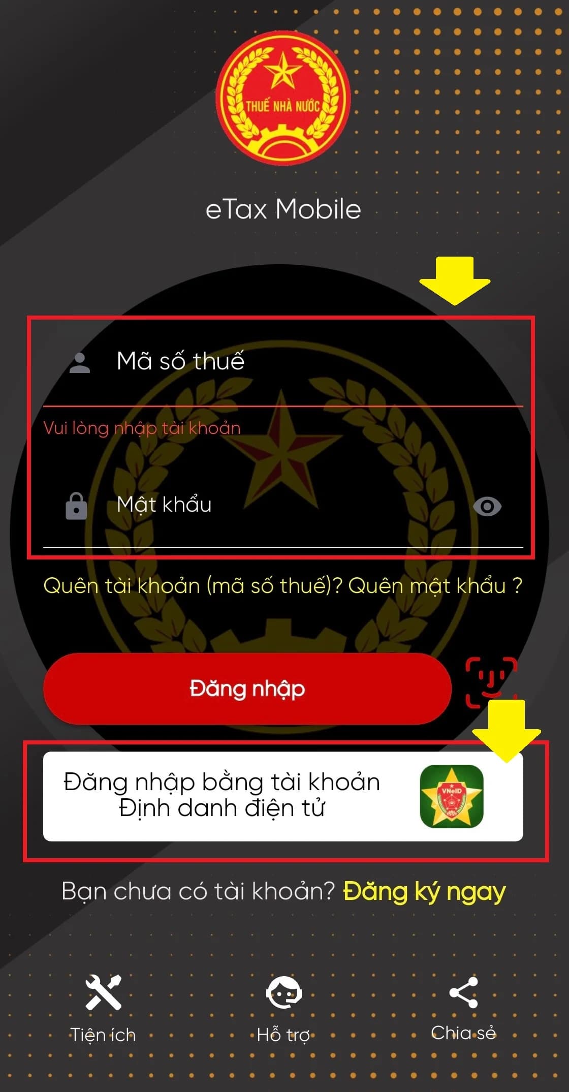 Bước 1: Đăng nhập ứng dụng Etax Mobile bằng tài khoản thuế điện tử hoặc tài khoản VNeID mức độ 2