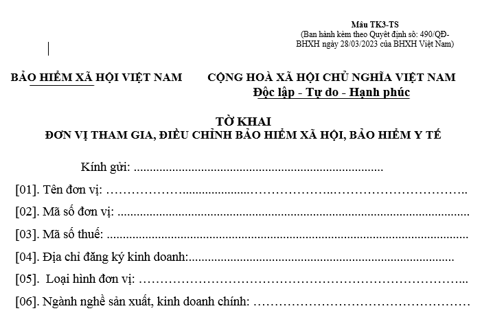 Mẫu Tờ khai đơn vị tham gia điều chỉnh BHXH, BHYT là mẫu TK3-TS ban hành kèm theo Quyết định 490/QĐ-BHXH năm 2023. Mẫu có dạng như sau: